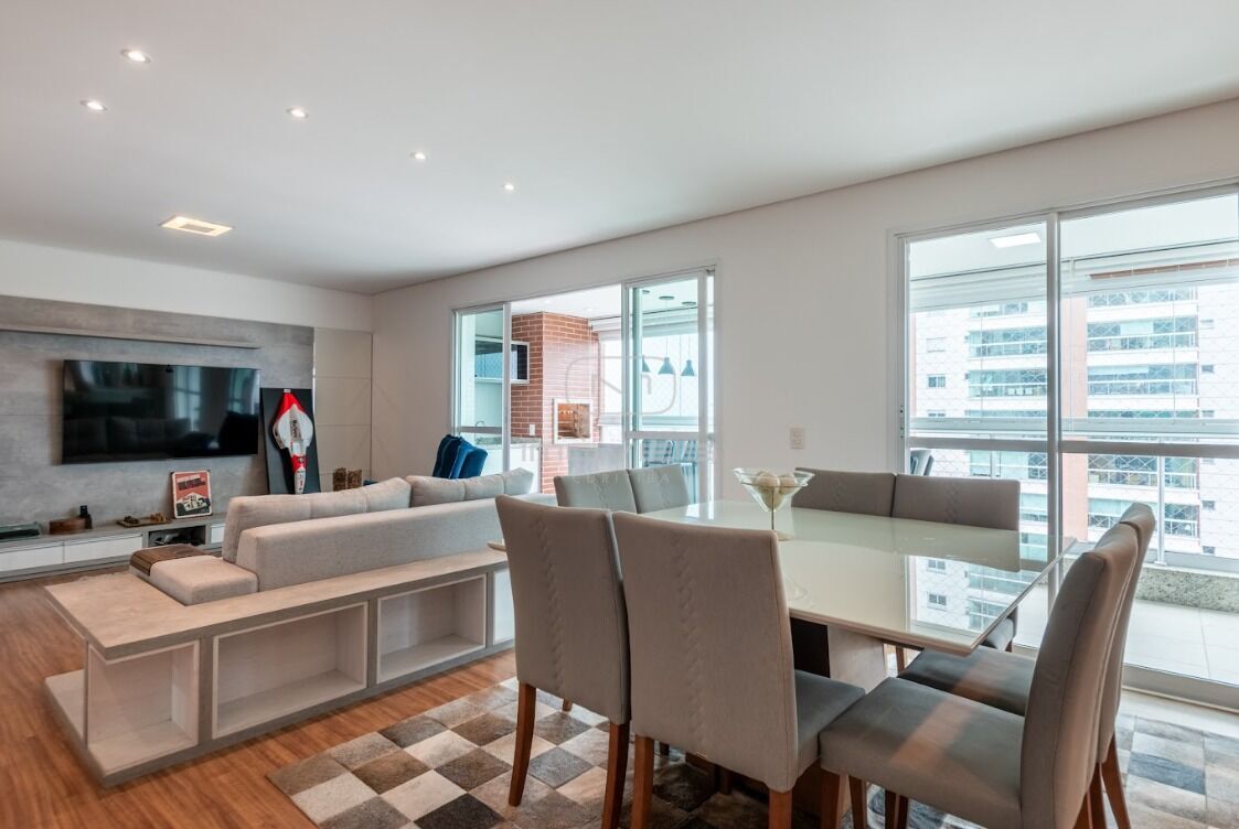 Sala ampla para 2 ambientes com sacada gourmet espaçosa;